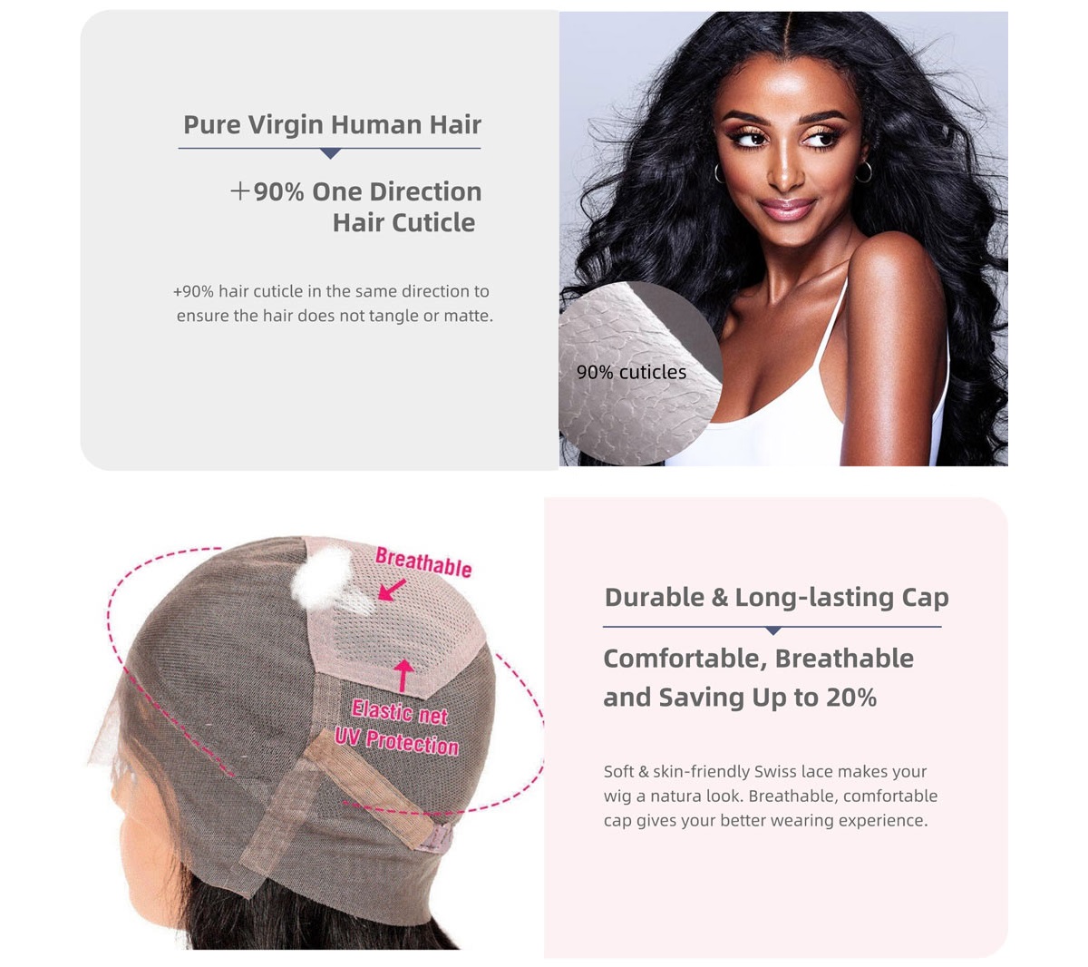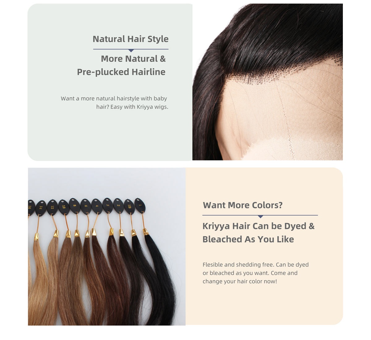 | Virgin Hair | Kriyya wigs are 100% virgin human hair wigs. Unprocessed high-quality virgin hair, without any chemical treatment, natural looking, super soft to touch, all hair cuticles are running in the same direction, no shedding and tangle, full and healthy ends. |